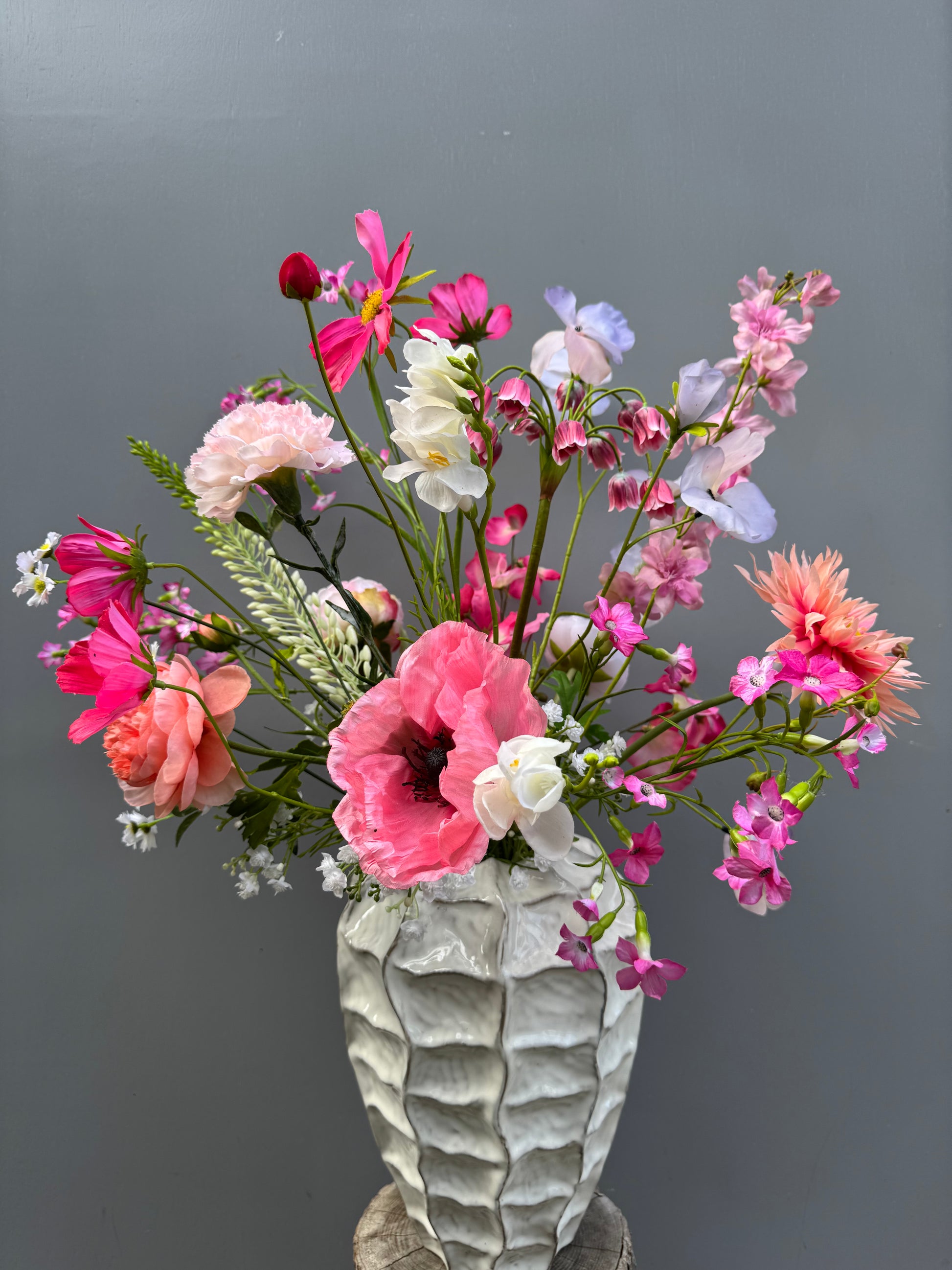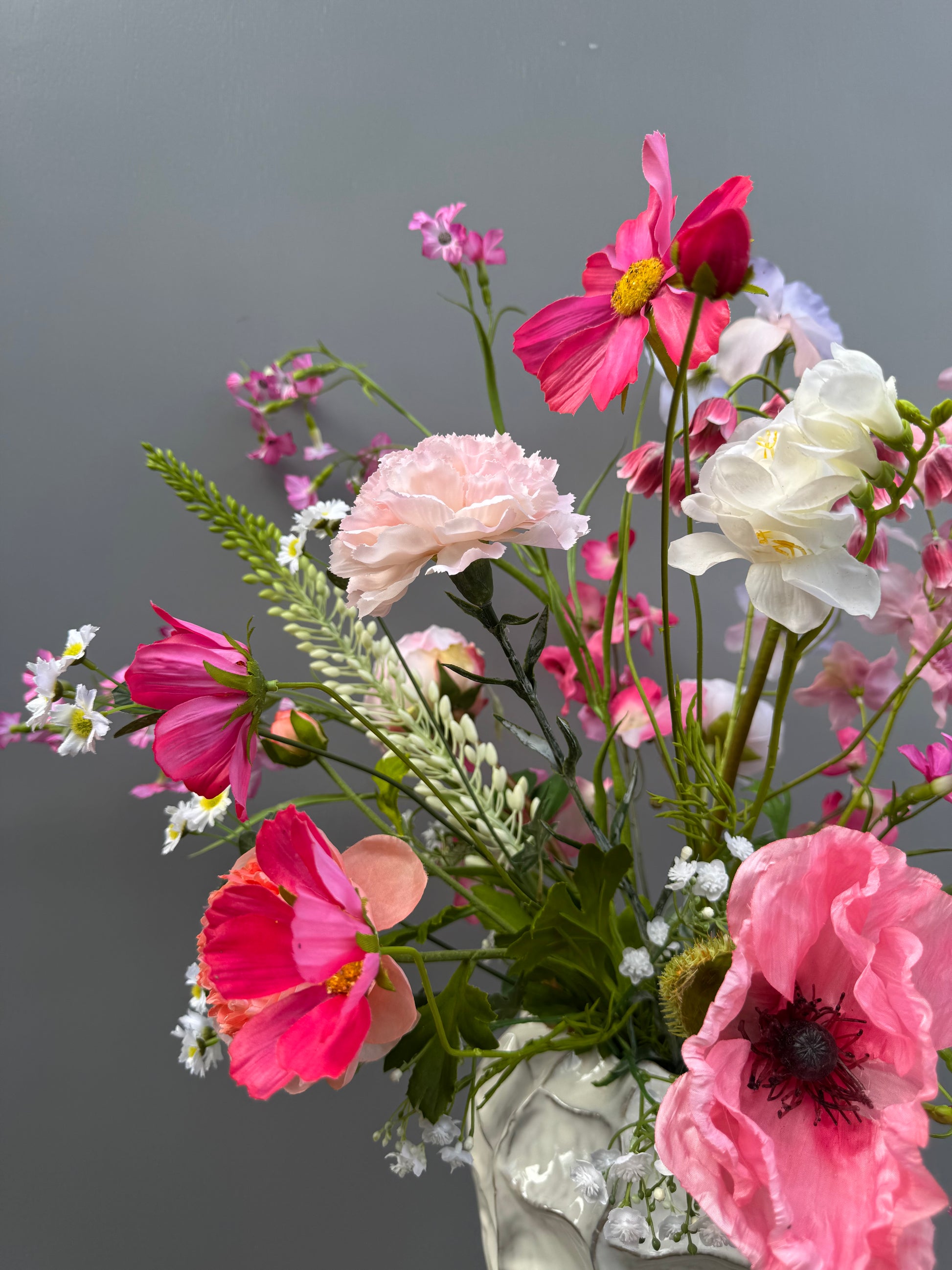 De mix van roze en witte bloemen zorgt voor een energieke en opgewekte uitstraling.