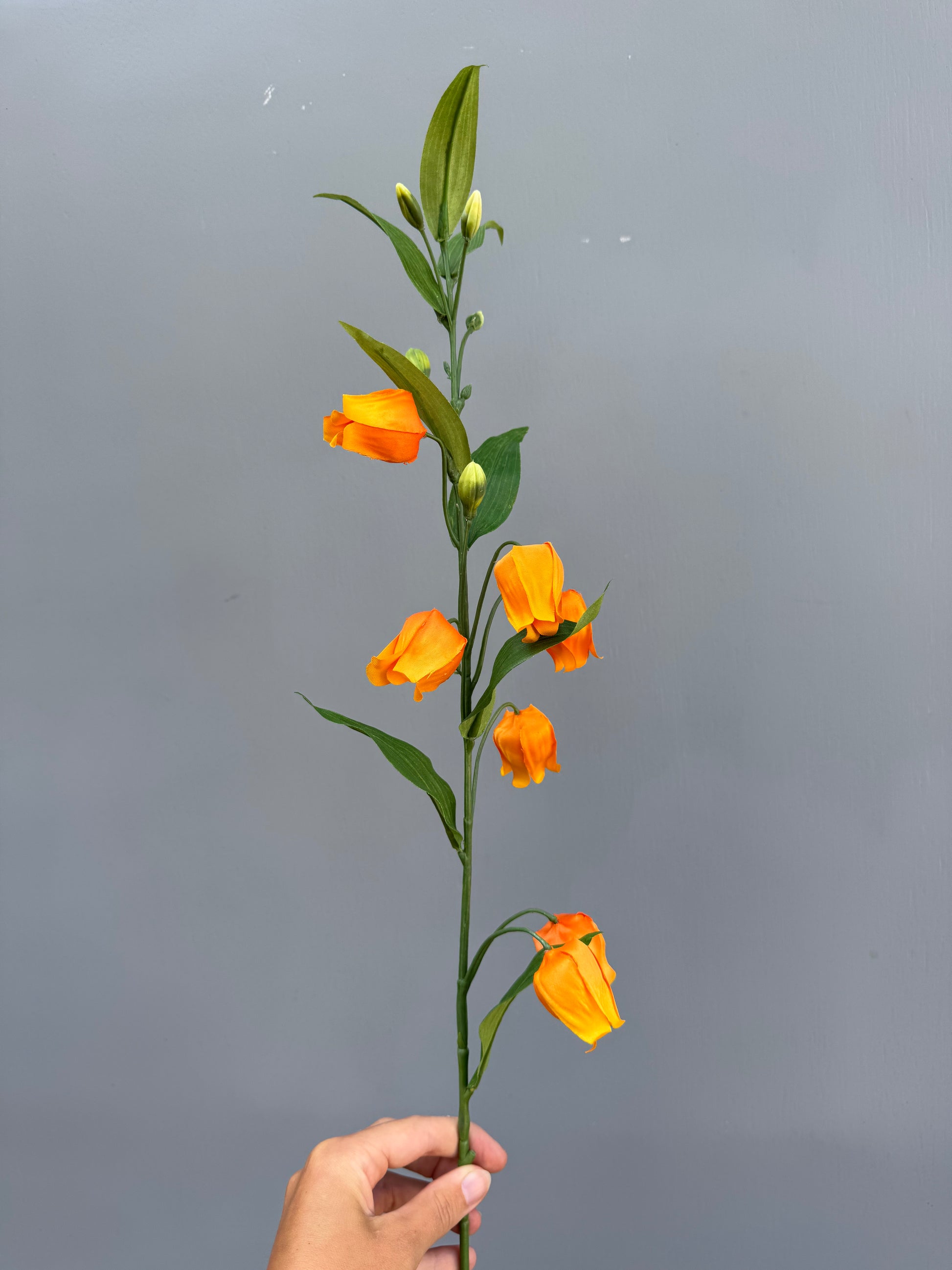 Deze zijden Sandersonia is een subtiele blikvanger met haar elegante, oranje lantaarnbloemetjes en speelse vorm.