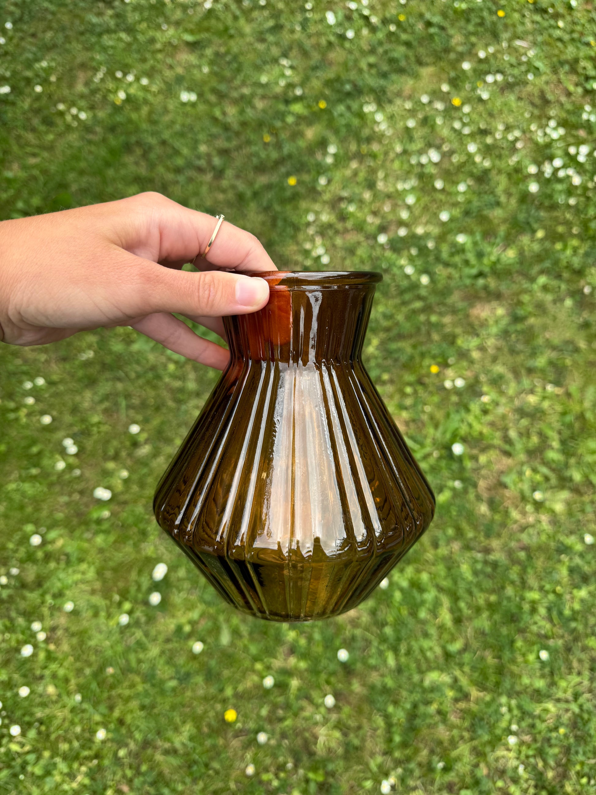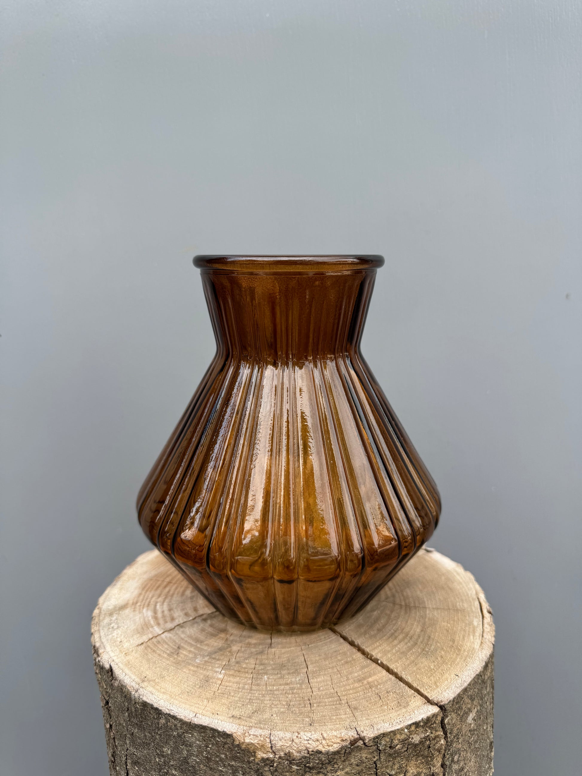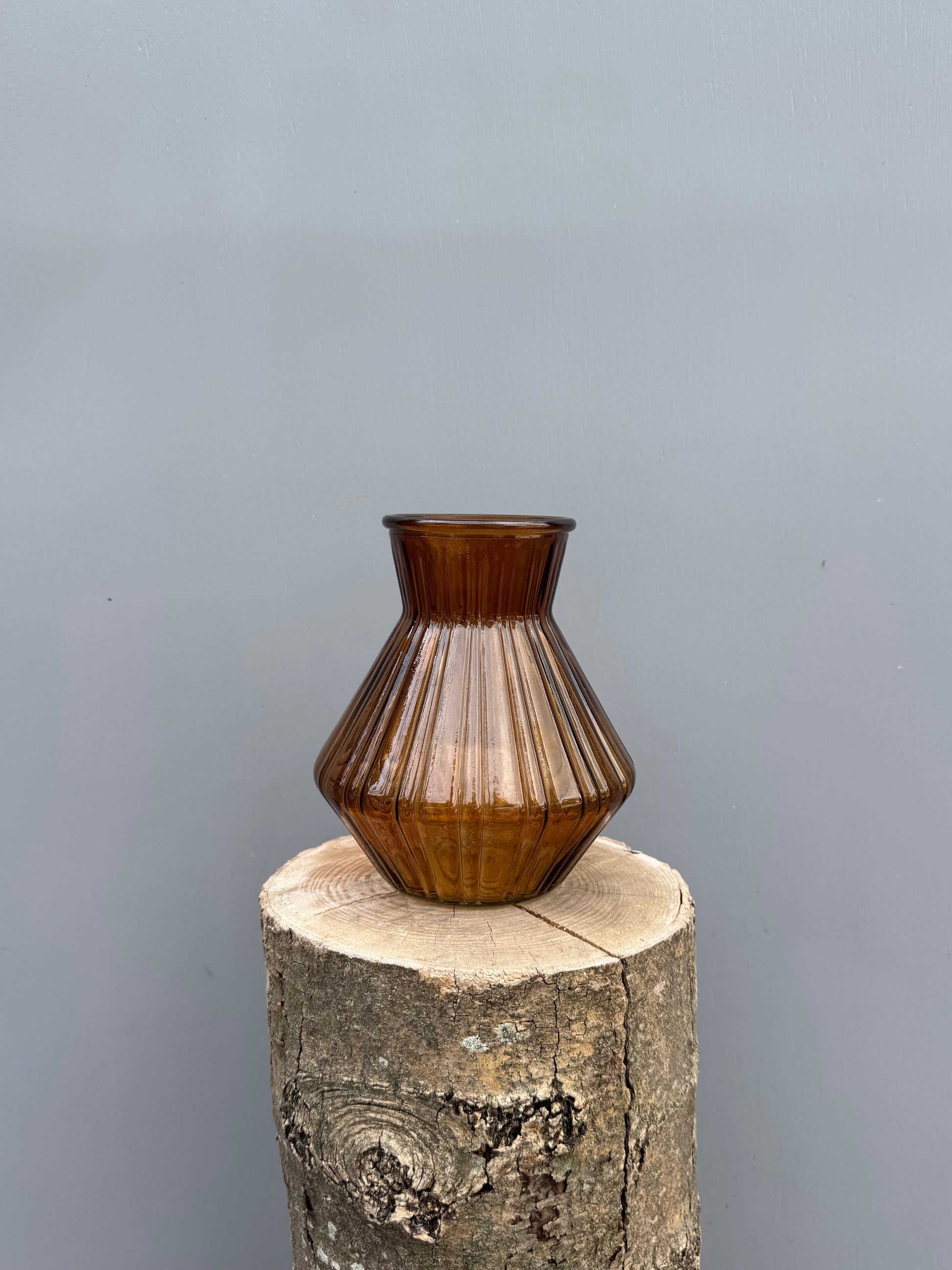 Breng warmte en karakter in je interieur met dit sfeervolle amberkleurige vaasje van glas. Het unieke geribbelde ontwerp en de warme bruintint geven dit kleine vaasje een vintage uitstraling, terwijl het toch perfect past in moderne en natuurlijke interieurs.
